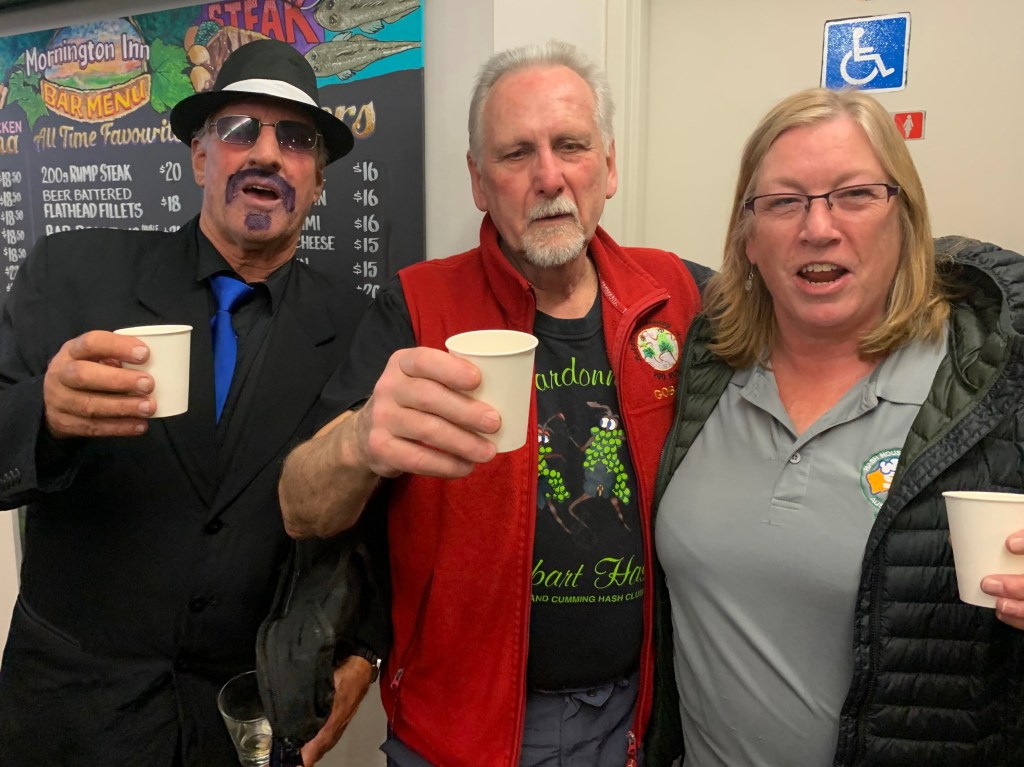 The pack gathered at the Mornington Inn, a fine establishment known for its location somewhere close to Bunnings, a diverse clientele, and an extensive range of Great Northern beer. Our Hare, Wee Bev, assured us that this run would be 7km for the runners and 4km for the walkers. She also warned us that parts of the trail would be slippery, and that she had marked sections where we should be careful – what could possibly go wrong?