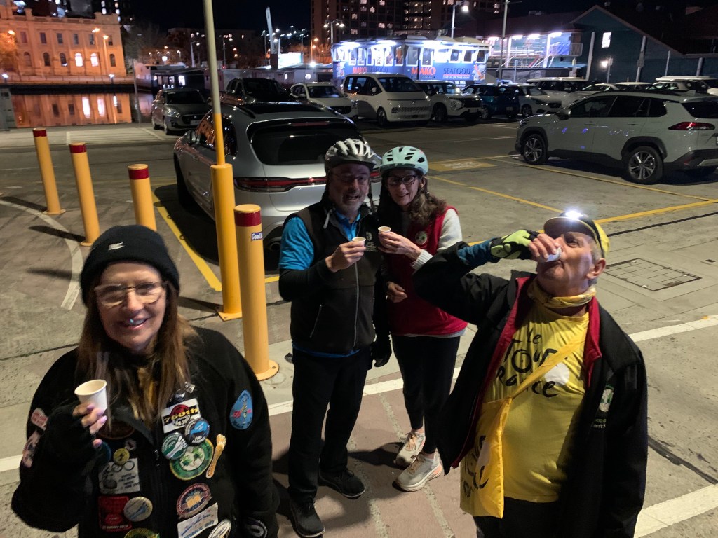 Chris Miss was on station providing plenty of freshly brewed glühwein rehydration fluids in readiness for the second downhill stage back into the city and wharf areas. With a peloton forming from the walkers teams there was a sudden breakaway sprint by Dyke & Grizzly to get the jump on the gay riders team led by In the Raw who was, as usual cumming in quickly from behind.