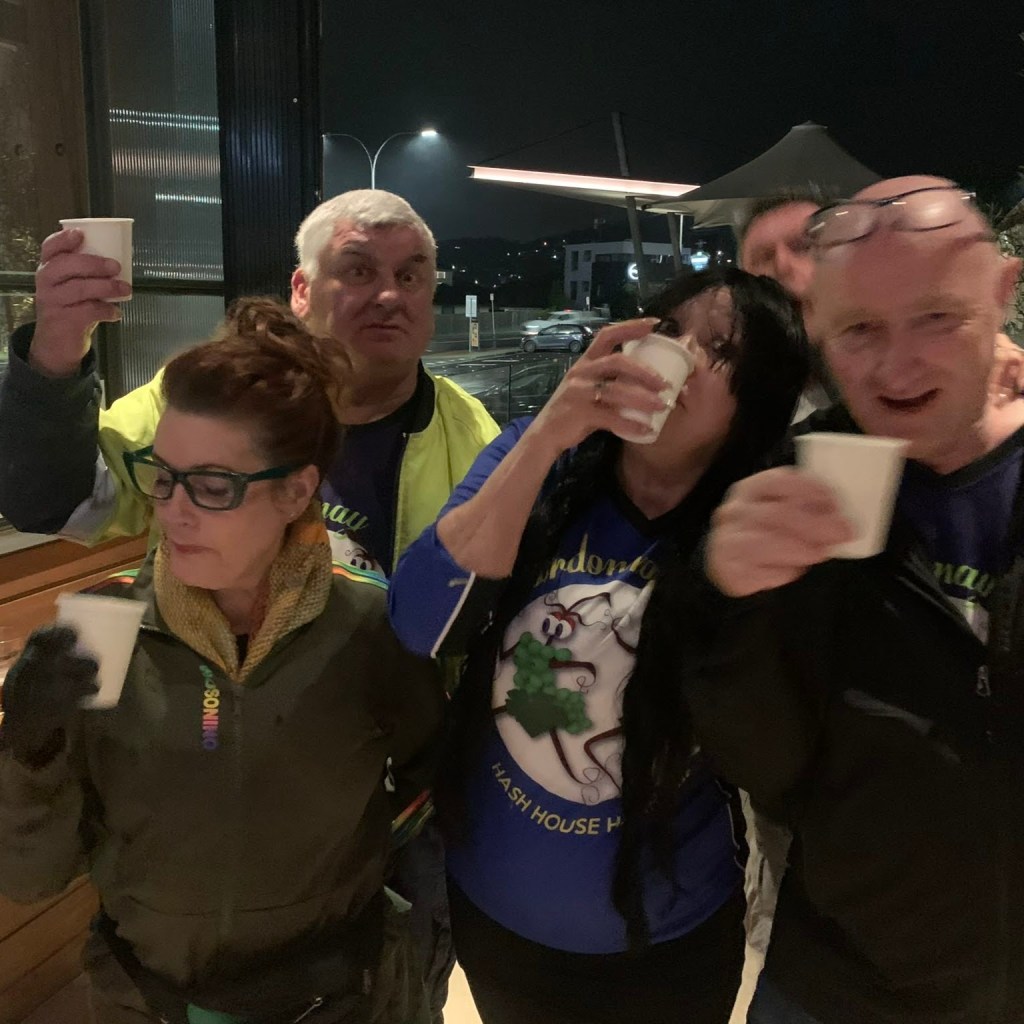 Last Thursday saw the Chardonnay Hashers gathering on the Eastern Shore where according to locals it never rains and is always an overcoat warmer. Well it was a mild evening and it didn’t rain. Apparently that wet stuff that came later was someone leaving the sprinkler on, according to Herr Flick.