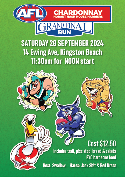 | 1437 | Saturday 28 Sep | Jack Sh!t & Red Dress AFL Grand Final R*n | 14 Ewing Ave, Kingston Beach | Slippery Nipple |