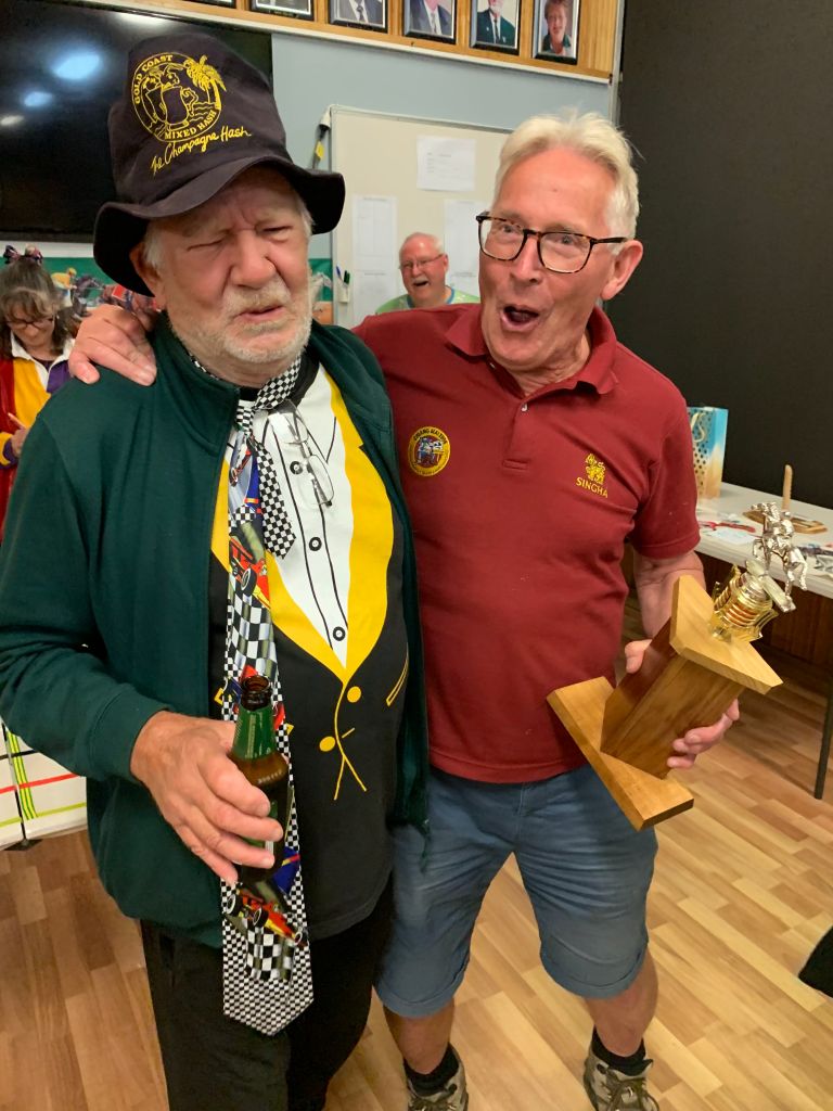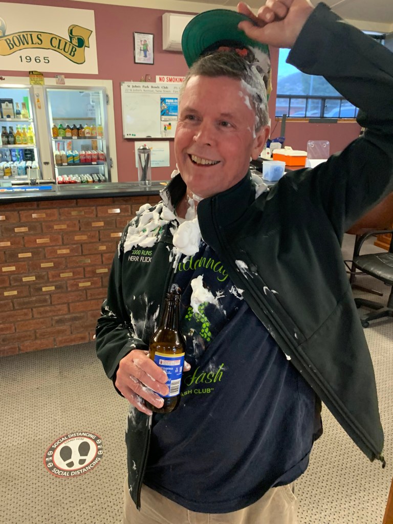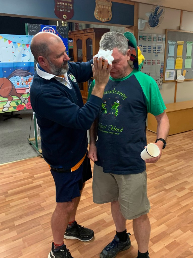 - Herr Flick: Duly creamed and awarded a badge for 1150 Hash walks! Apparently he is currently second in the lead table of Chardonnay Hash attendees.