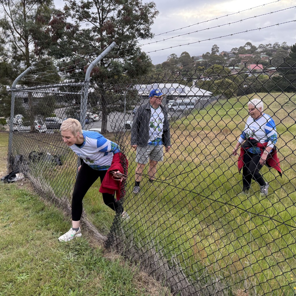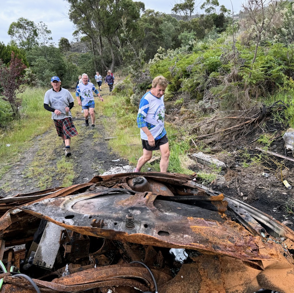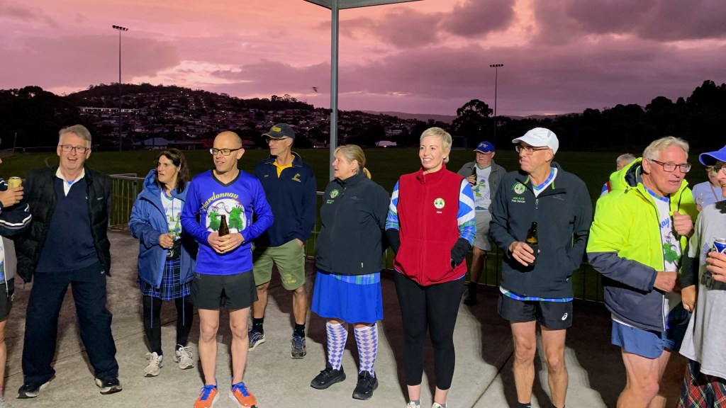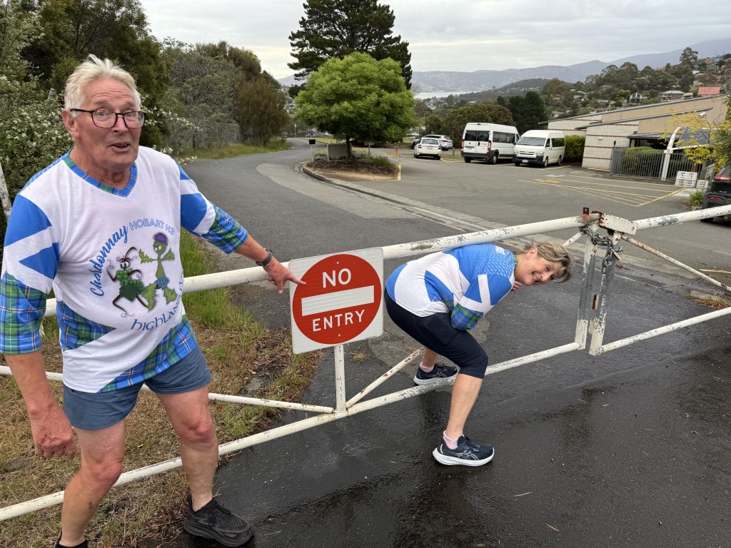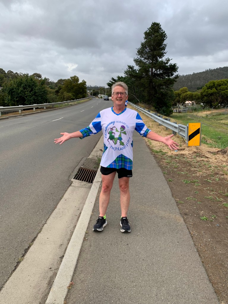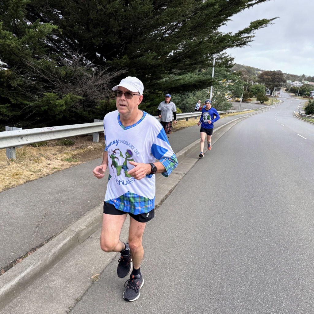 The Hare had done a fine job keeping the front runners going back and forth and the walkers – most of the walkers – fairly close. We crossed the Tasman Highway via the footbridge, but then reverted to running on soft, boggy ground along the Highway verge. A few pairs of Hokas needed a good scrub after that.