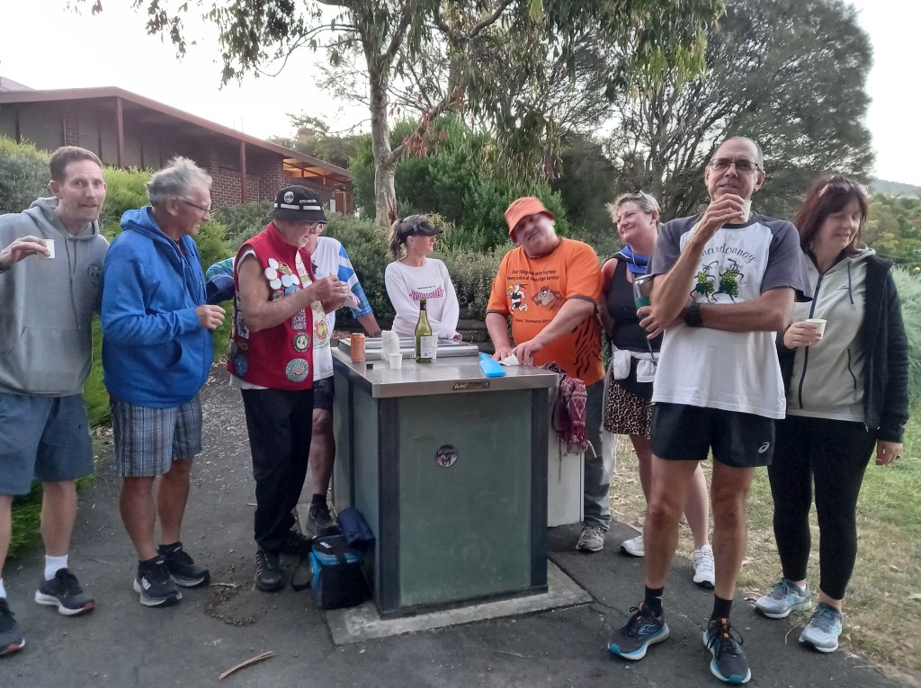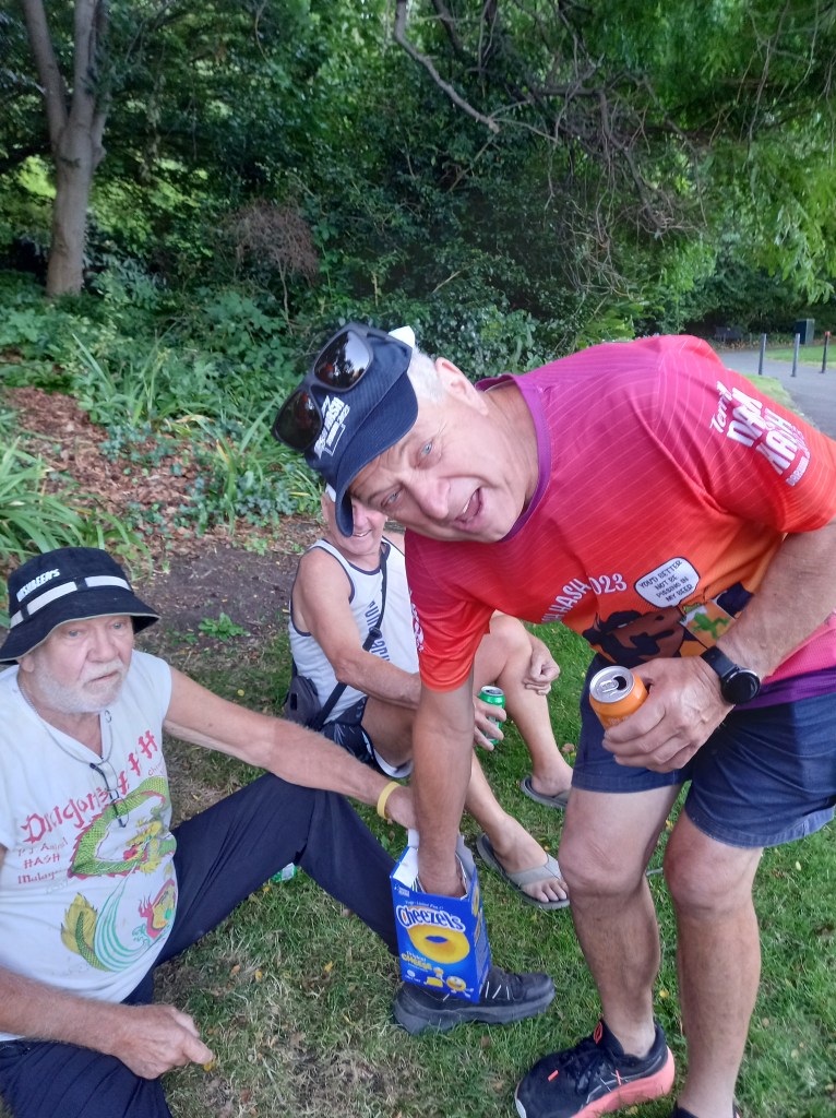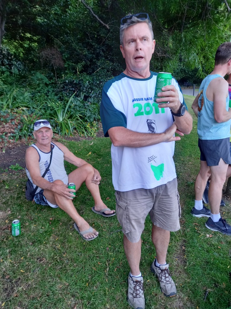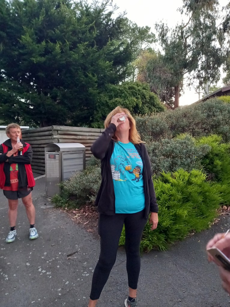 The trail continued through the streets of South Hobart and around the hills of the water works for the runners, then into bush tracks, eventually leading back to the well-stocked piss stop at the base of Fitzroy Gardens. We then returned to Parliament Park for chicken, salads, and jelly shots.