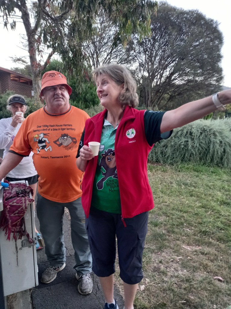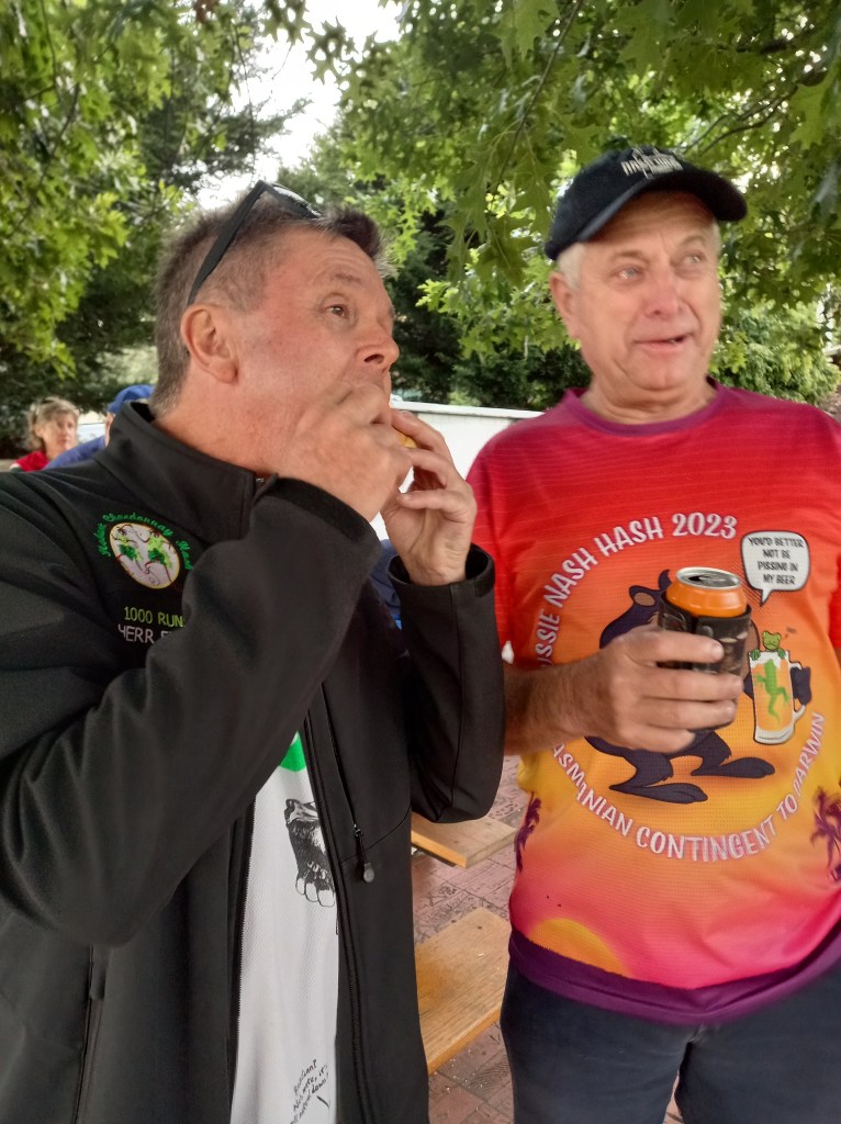For all the hashers it is just to follow the trail walkers one-way up South Hobart and no need for searching for trail markers as it was well marked to be seen by all. Anyway, the trail headed around the streets of south Hobart till we around the hills of the water works for the runners then into bush tracks eventually popping out behind the dam grounds heading back down the road to get to the well-stocked piss stop back at the base of Fitzroy Gardens. One Drink and piss off as the food was being served back in Parliament Park. Chicken and salads were on the menu. It was an easy trail to follow. Jelly shots challenged the tongues of many of the more experienced hashers. (I’m not sure of what they were experienced in). We all waited for the lip session from Spoof and Nancy Boy.