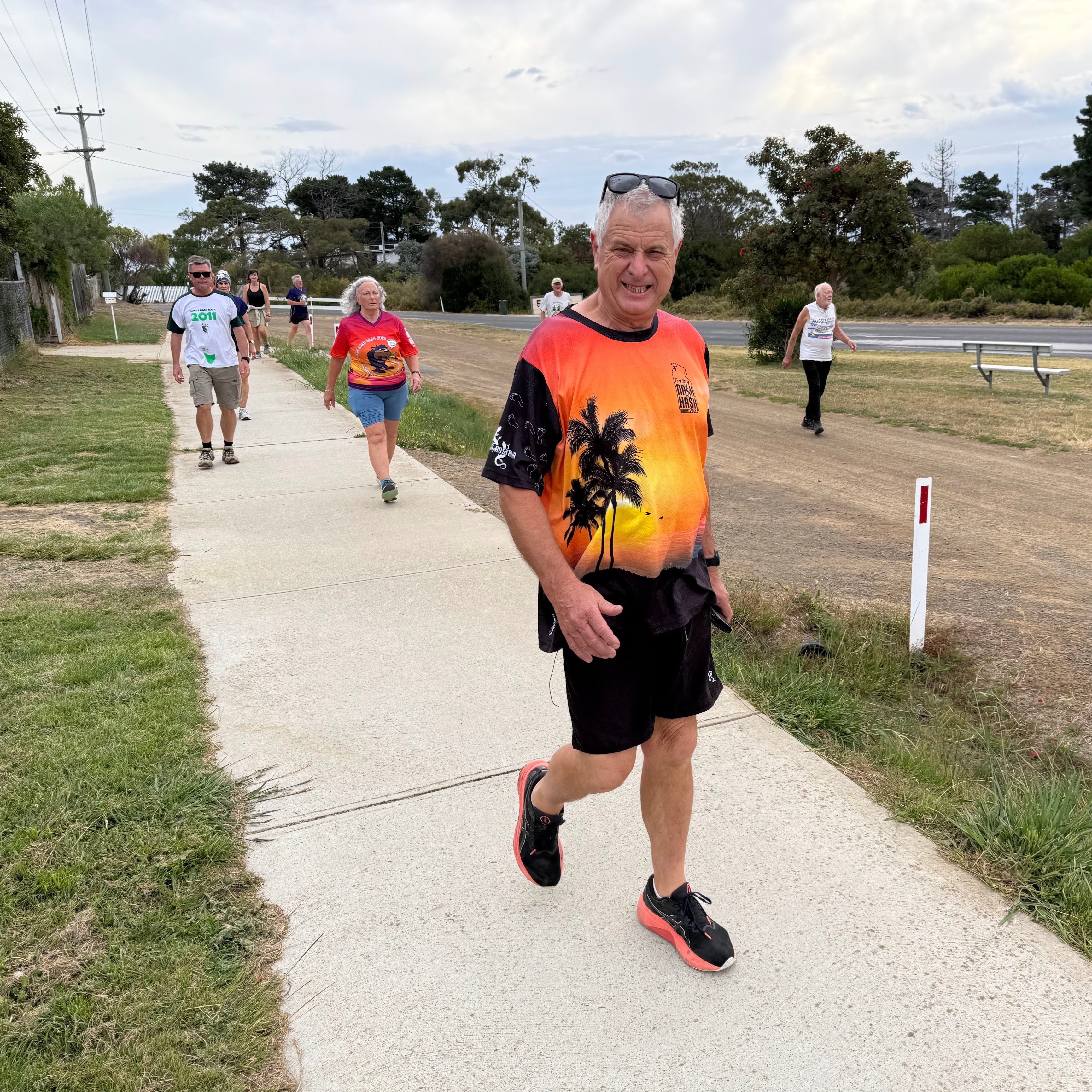 After a series of twists and turns through the dunes that left us feeling like we were in a sandy labyrinth, the trail finally spat us out onto Carlton Beach Road. Chaos ensued as runners and walkers alike tried to decipher the cryptic trail. The front walkers, led by the intrepid Poley, ventured up Paneminner Street only to hit an FT – classic Poley move who usually delegates the finding of false trails to others.