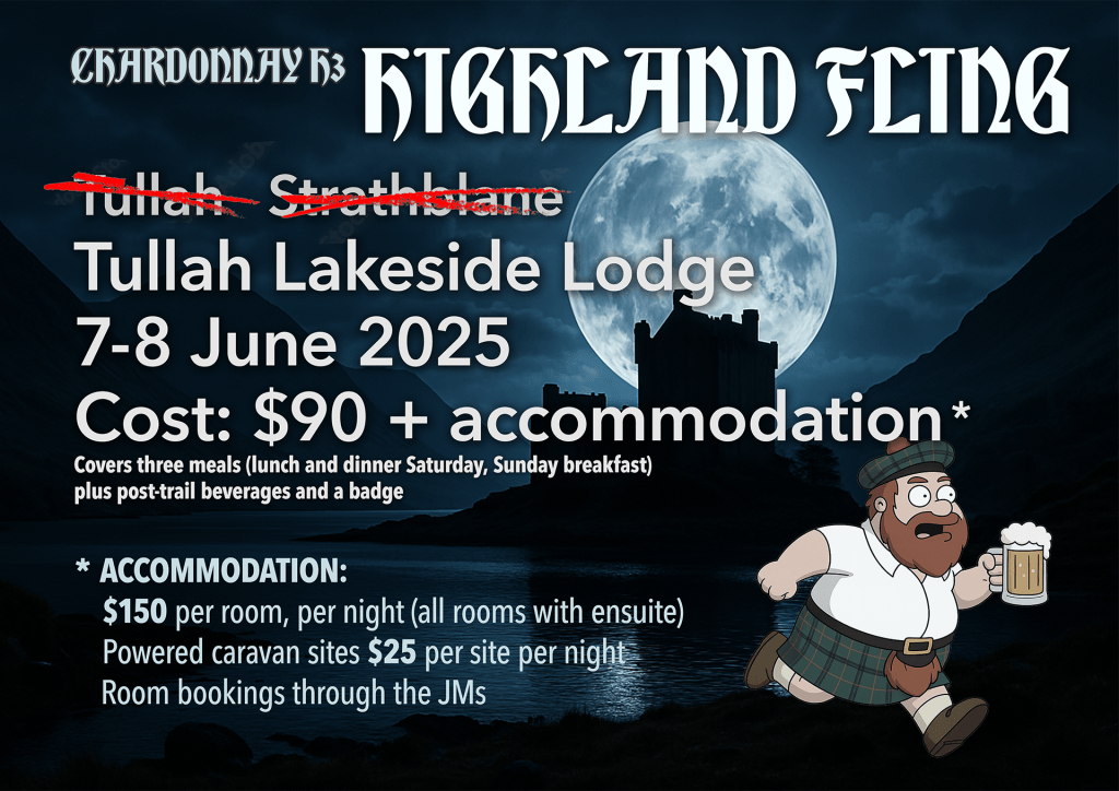The cost of the Fling will be $90, plus accommodation. The Fling fee covers Saturday lunch and post-trail drinks, two-course dinner on Saturday night, buffet breakfast Sunday morning, and your commemorative badge. You can pay your Fling fee to the Chardonnay Hash Cash on any Thursday, or contact us for details for a bank transfer.