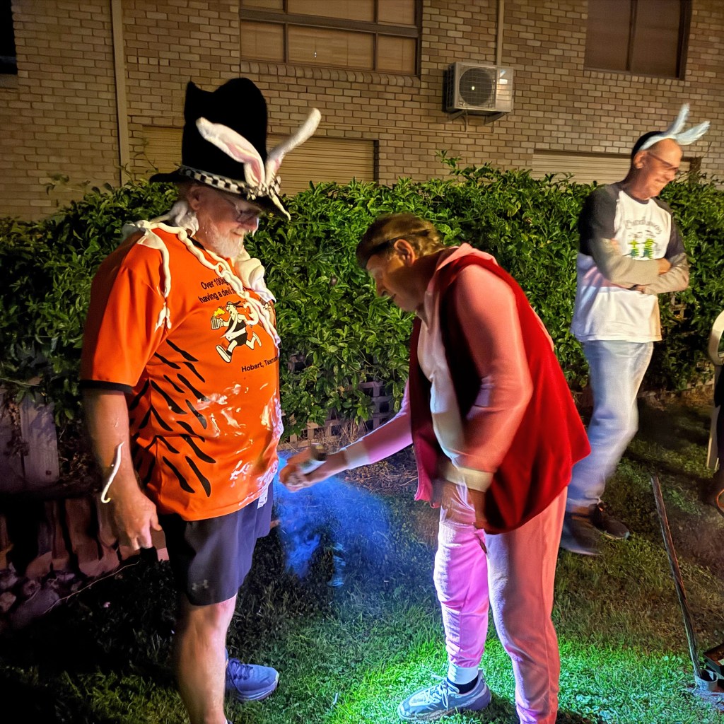 Fringe Benefits couldn’t resist the pull of reliving past ecstasies swinging and sliding on contraptions that made her smile! A group of us gathered here, some with syndromes* and some just in prayer waiting for the holy Eucharist and wine with bubbles to appear but there was no miracle, no loaves, no fishes and no fucking grog! Sonar and Uber were beside themselves and each other in complaining. It turns out there was no horse to pull the holy chariot to the piss stop so back to the citadel of the JM for grog, bubbles, pizzas, a warm fire and ridiculous head wear. (Not you Morticia).