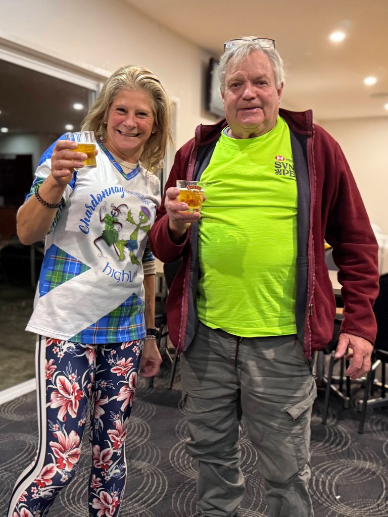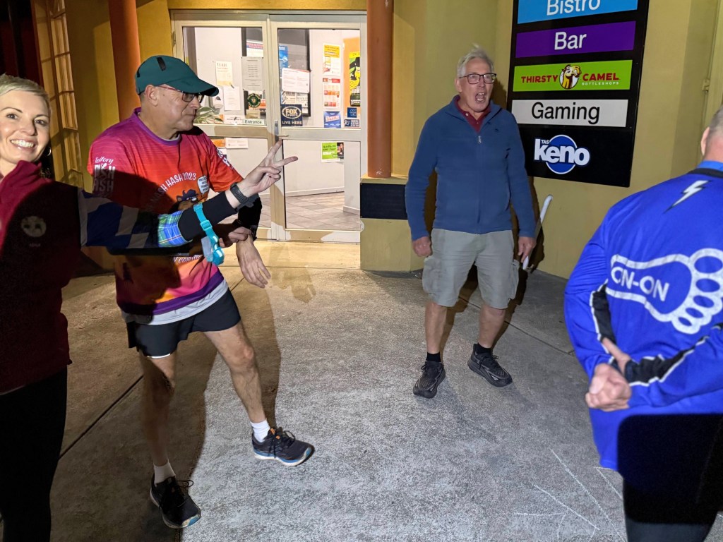 At 6.31pm Hooray gave instructions there was a run/walk and it started over the road, it was obvious, that no-one listened with Hooray having to shout out we all were going to the wrong way hooray for that. Once heading in the right direction, the run/walk took us around the street of Midway Point with white chalk on white footpaths many a hasher found it a bit hard to see especially at night.
