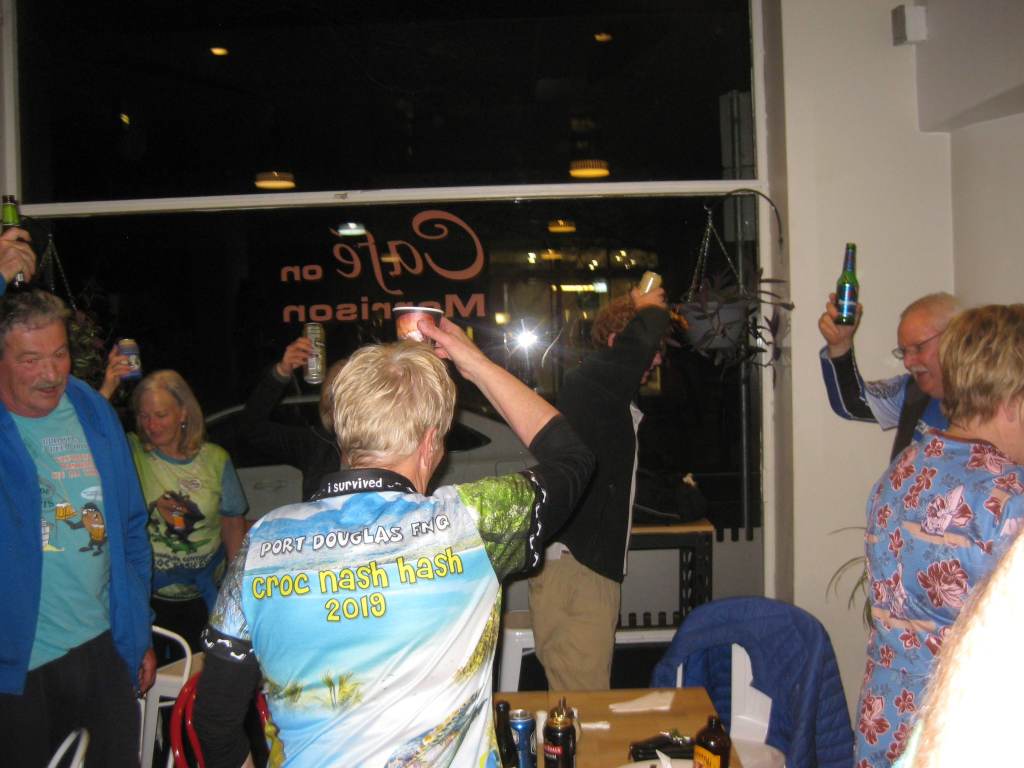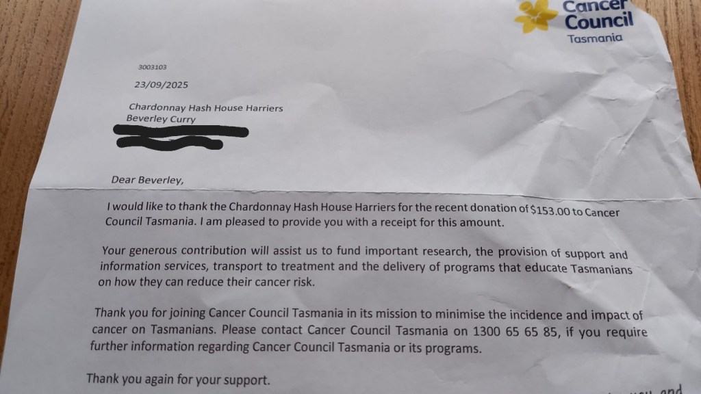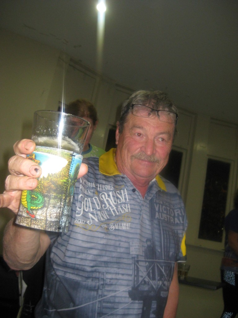 Well on a not so pleasant night it appears Chardonnay has more than one soft cock amongst the ranks. As only 18 turned up to the run from Midway Tavern. As usual 6 31 we are off and guess what there’s a piss stop. Runners took off as normal up past the bottle shop and into the streets of midway. Walkers not in such a rush which worked out well as the runners did the FTs. Walkers were just cruising along finding it difficult at times to find trail eventually lost completely hashing through a park gingernuts decided she would have her own piss stop and headed back to the pub. Piss stop was finally found one beer and off home. All in all, a small group but a good night.