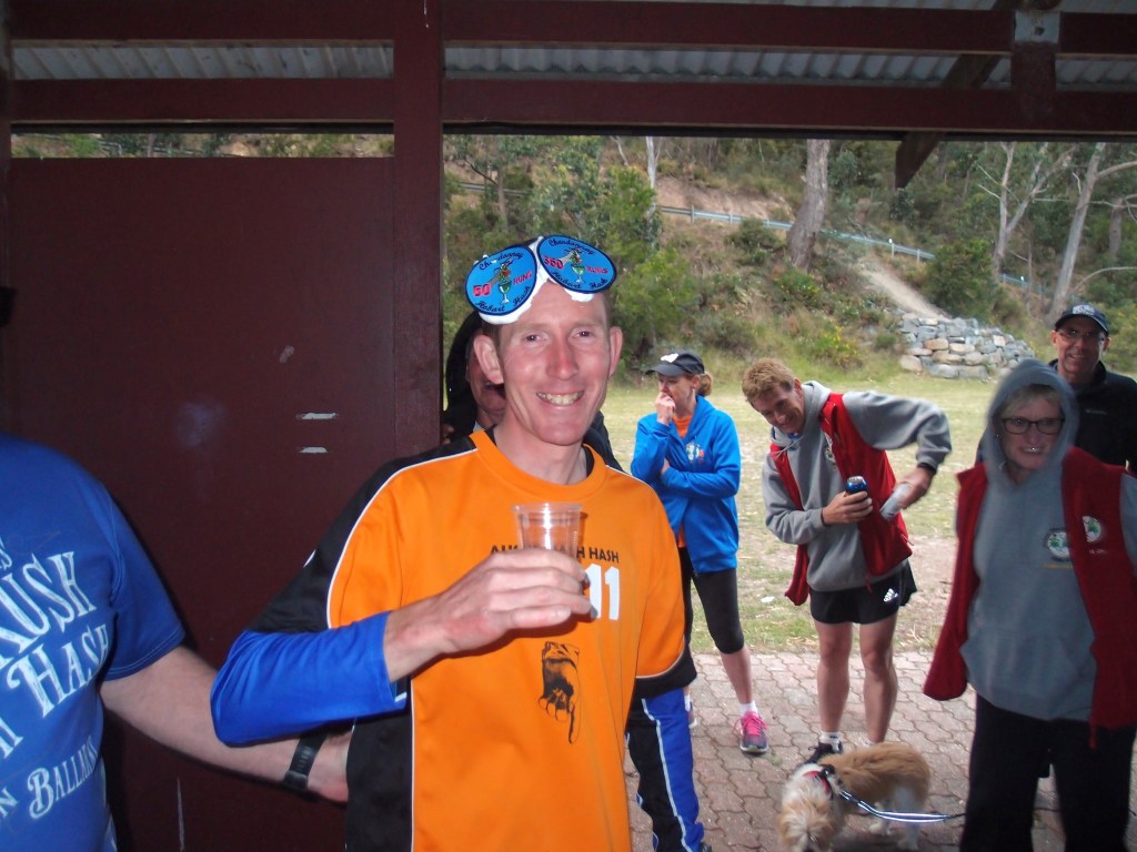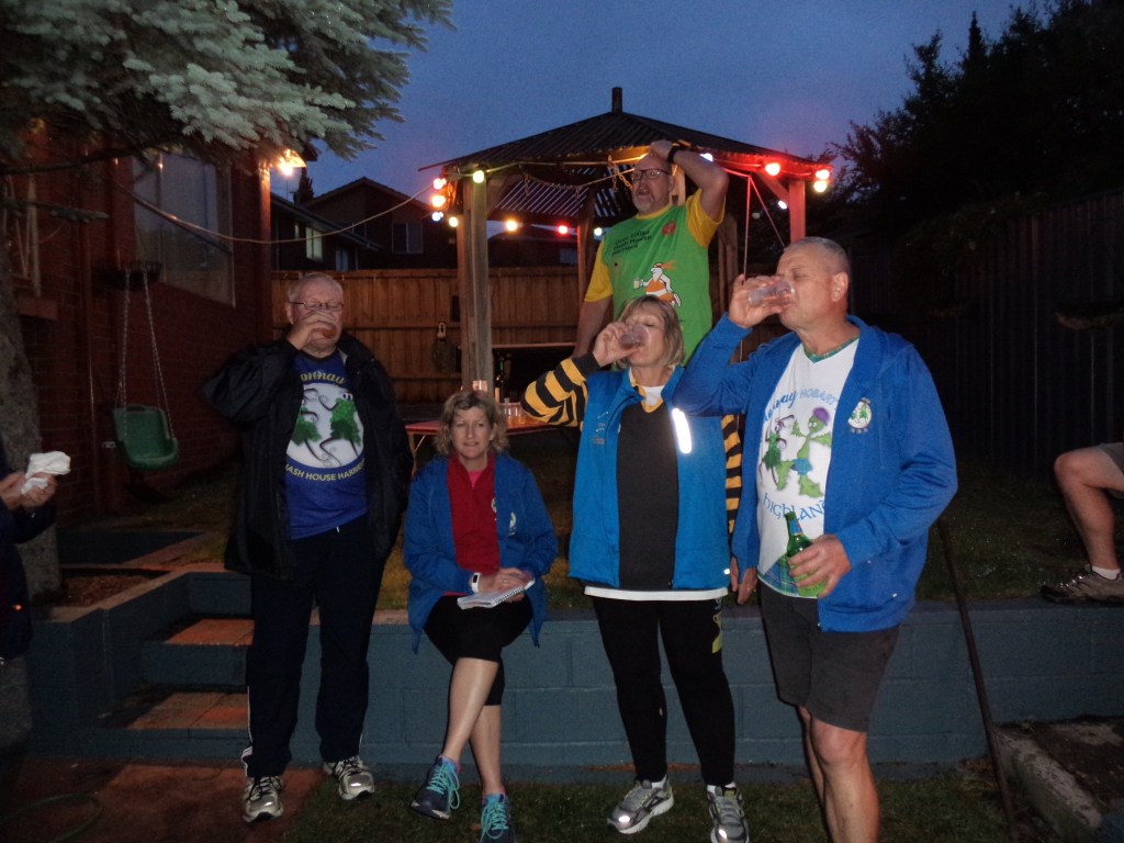 On a frigidly cold spring cough cough eve15 brave Hashers arrived! Hooray and Uber took to the oval to play footy. Neither could catch blaming it on the wind or cold hands…yeah yeah yeah. Uber talked about the good ol’ days in his footy playing in this very oval! TwinkleToes told us upon our eve journey this would not be a replay of Dykes run of last year. A big sign was heard amongst the Hashers rugging up. We moved forth with most on the walking trail and one (Hooray) on the runners trail. I stayed back with a bum knee so I just walked about amusing myself …… I mean keeping warm. Ther bright pink cheeked Hashers returned and ready to eat the nice spread TwinkleToes provided us with and a drink to hopefully get the blood flowing! Thank you to Dyke for adding his famous rhubarb chutney! Recipe pleaseeee. As I with everyone else feeding our faces Nancy Boy was concerned about Hooray’s whereabouts as it was 8pm. He said to me that we should go look for him. I said nahhhh keep eating he will get back sooner or later. Hooray arrived ten minutes later with a smirky smile as we applauded him. We then ate some more, we shivered, we sculled with the lip session and babbled on…….