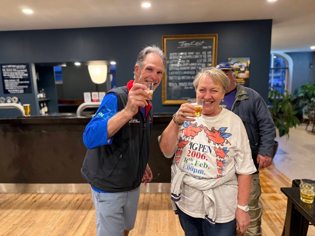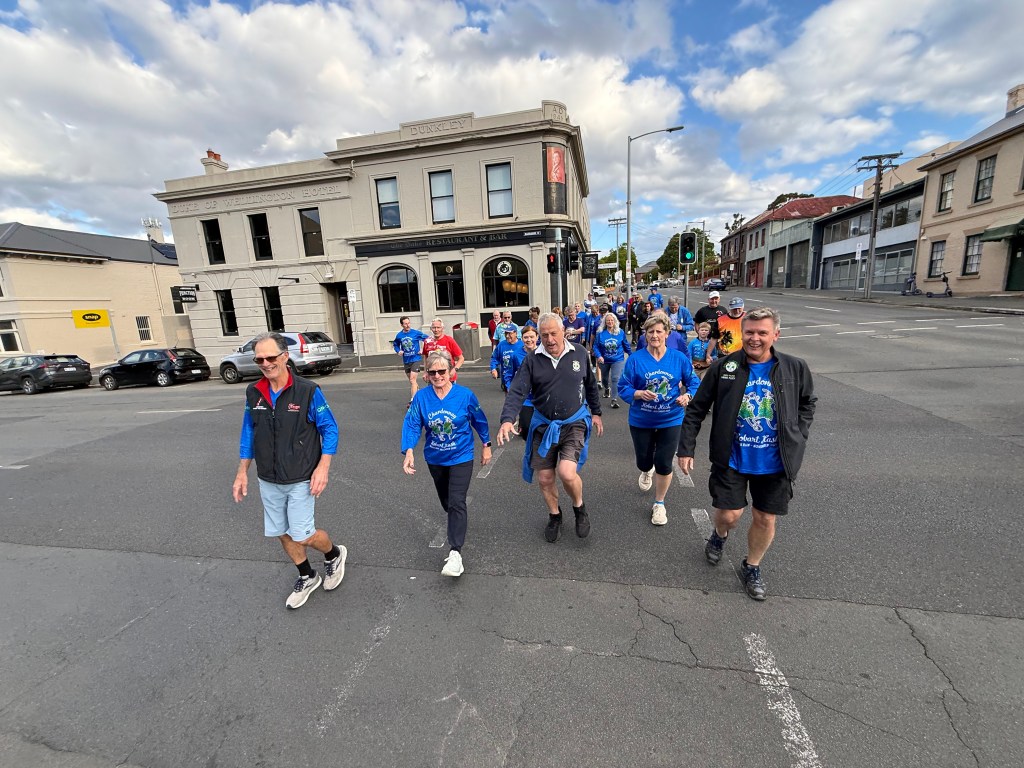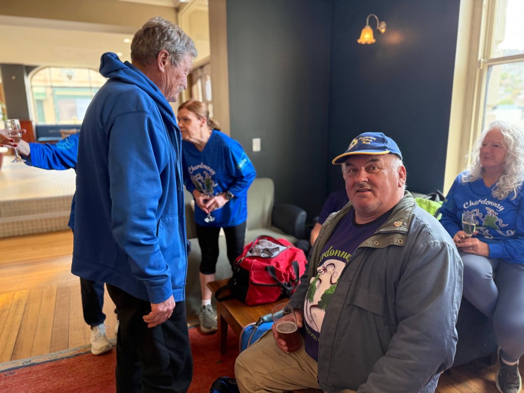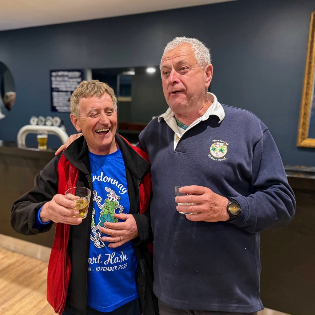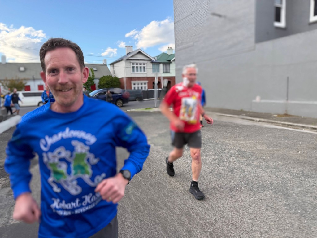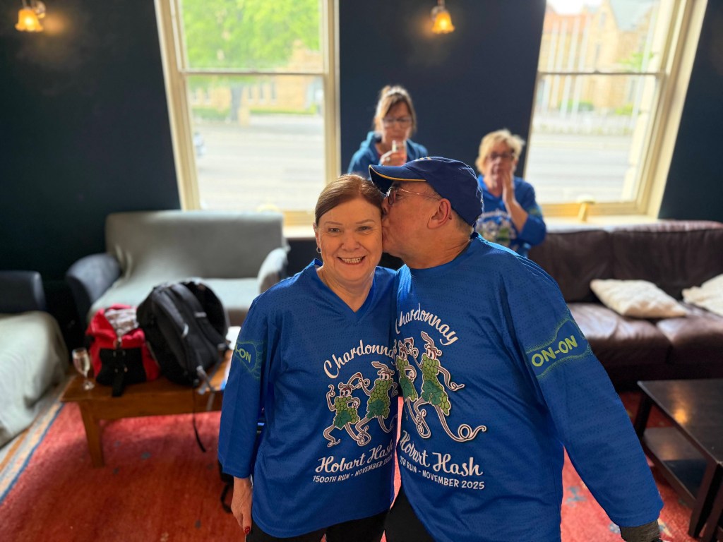 Run #1500 or was it #1501? Oh well who cares at least most of the 33 people got dressed up in brilliant blue shirts and showed up at The Duke for an inspiration run/walk put on by the JMβs with wait for itβ¦..2 piss stops! Much appreciated by the hard-core drinkers (no names)! Across Davey St we ran then back to Piss Stop #1 at the Globe car park. Then along Fitzroy Place, but no time given to admire the old military officersβ residences as I was confronted by Griz βthe human roadblockβ who managed to take up all 4 lanes of the footpath. We then went down to the water front past the parking fines Big HQ also known as the Hobart City Council and on up to Davey Street to the Old Motor Showroom for Piss Stop #2 This is where Uber put up a $$ Million Dollar deposit on a soon to be built luxury apartment while the rest of us enjoyed chips, bubbly, beer and the usual trash talk.