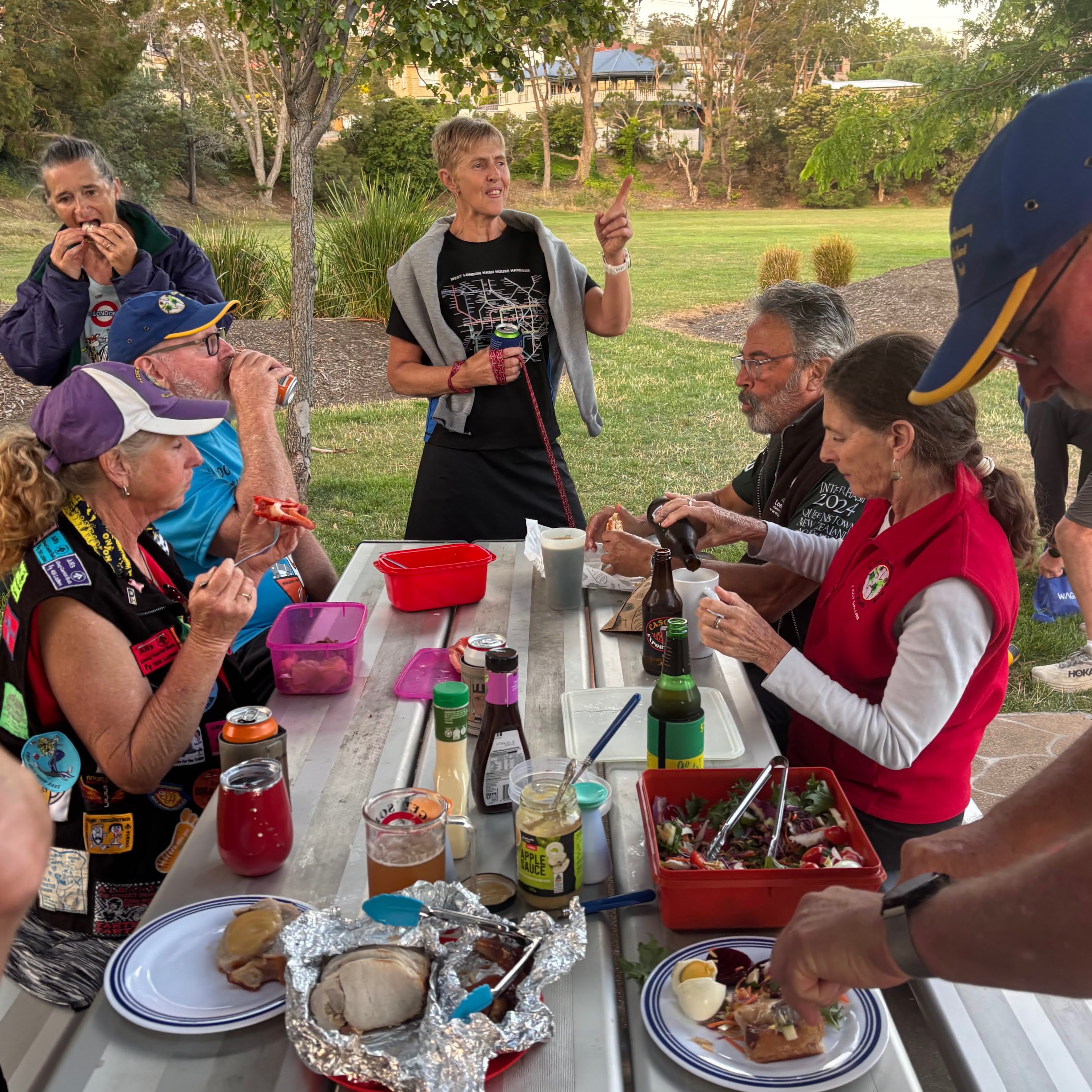 Back at the barbecue area we finally had it to ourselves and the usual victuals, skols and camaraderie ensued. Hats off to the new Lips — Hands On and Uber — they did an excellent job. Arsecutter looked very much at home in his role as the new Trailmaster walking around with his calendar.