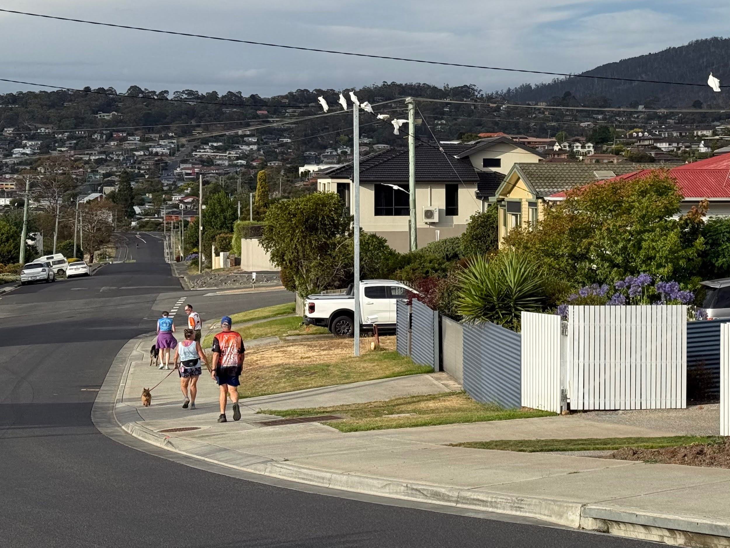 Trail instructions were given out and we headed off in the direction of Montagu Bay Primary school, under the bridge and along the panoramic river track. Trail then followed up some steps into Marana Avenue and onto Chatsworth Street, along Topham and Yolla Streets to an overpass crossing the East Derwent Highway.