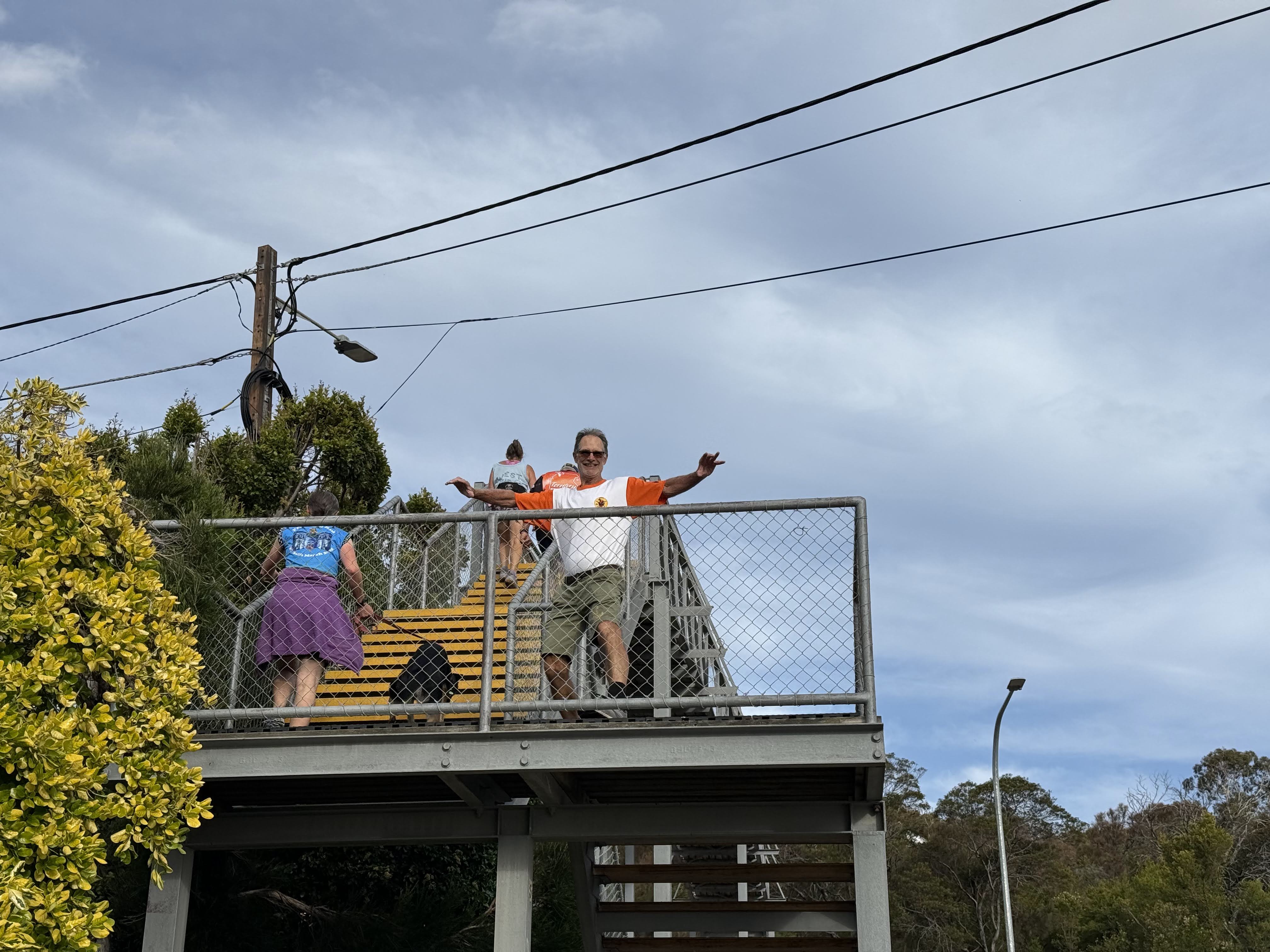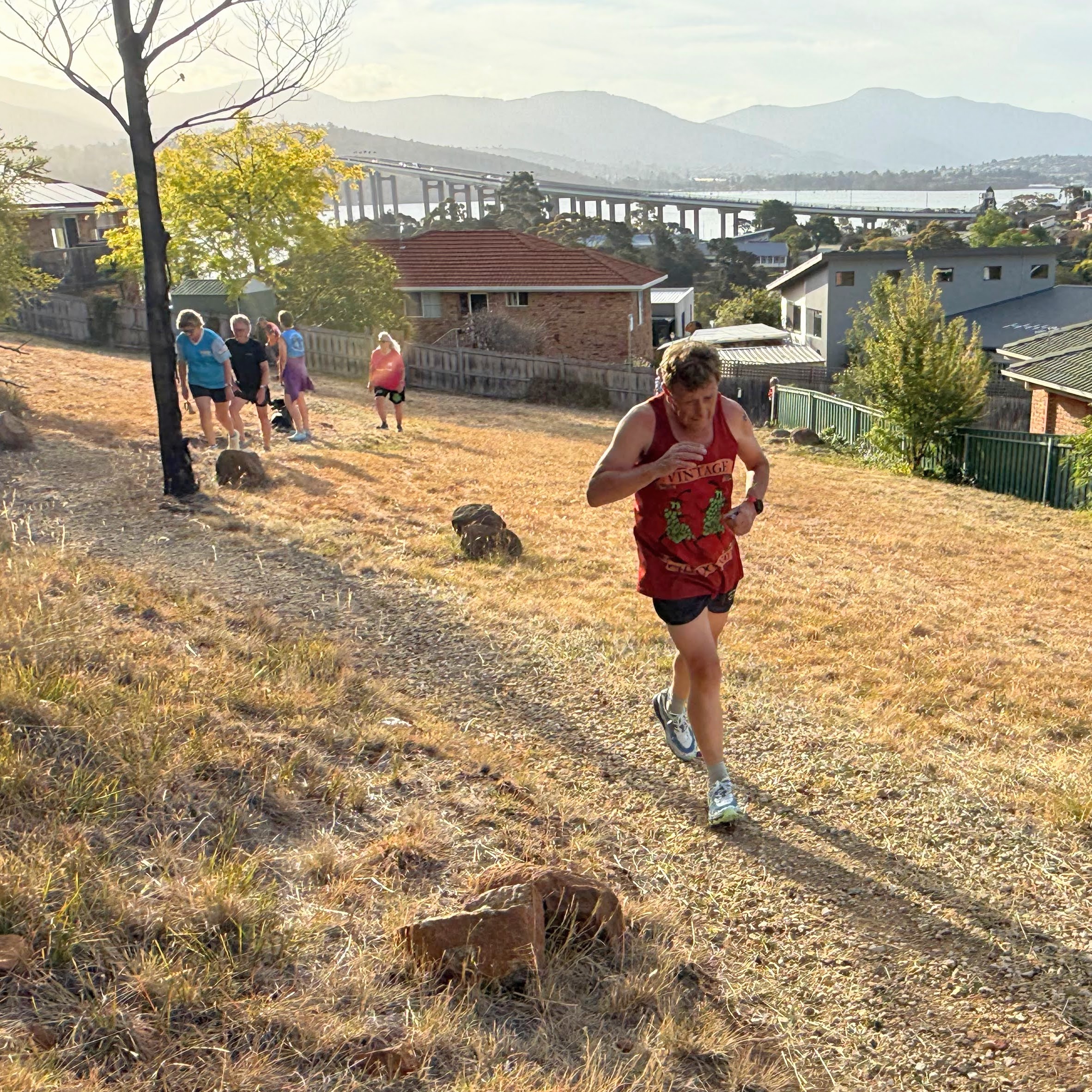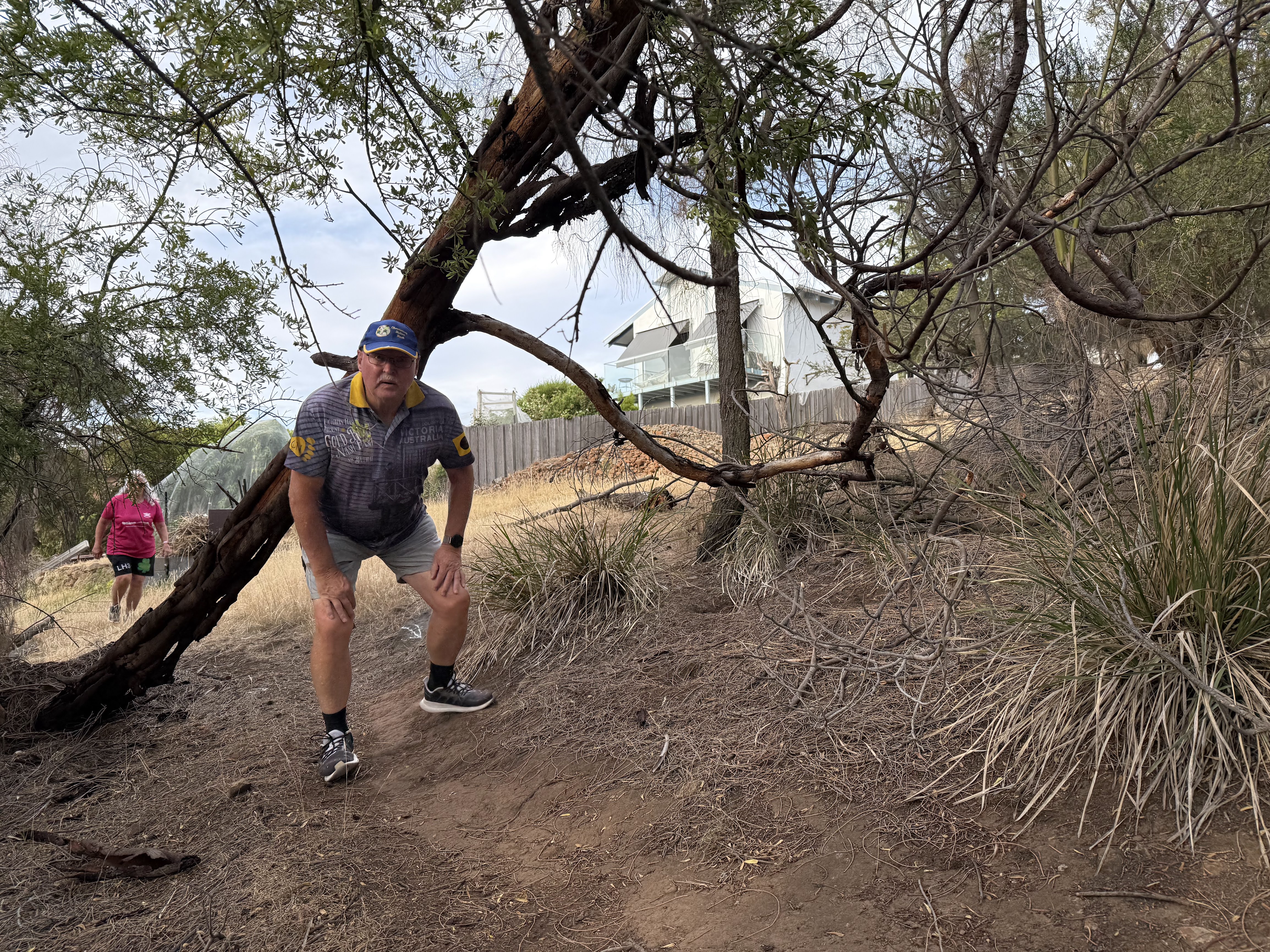 We found ourselves in some light bush/scrub area below Rose Bay High. Trail led us onto the walking track beside the Tasman Highway and then over another overpass bringing us back into the streets below the Rosny Hill Reserve. The tailenders looked up at the hill with a sigh and then at the arrows ahead and sure enough it was up up up onto the circle track.