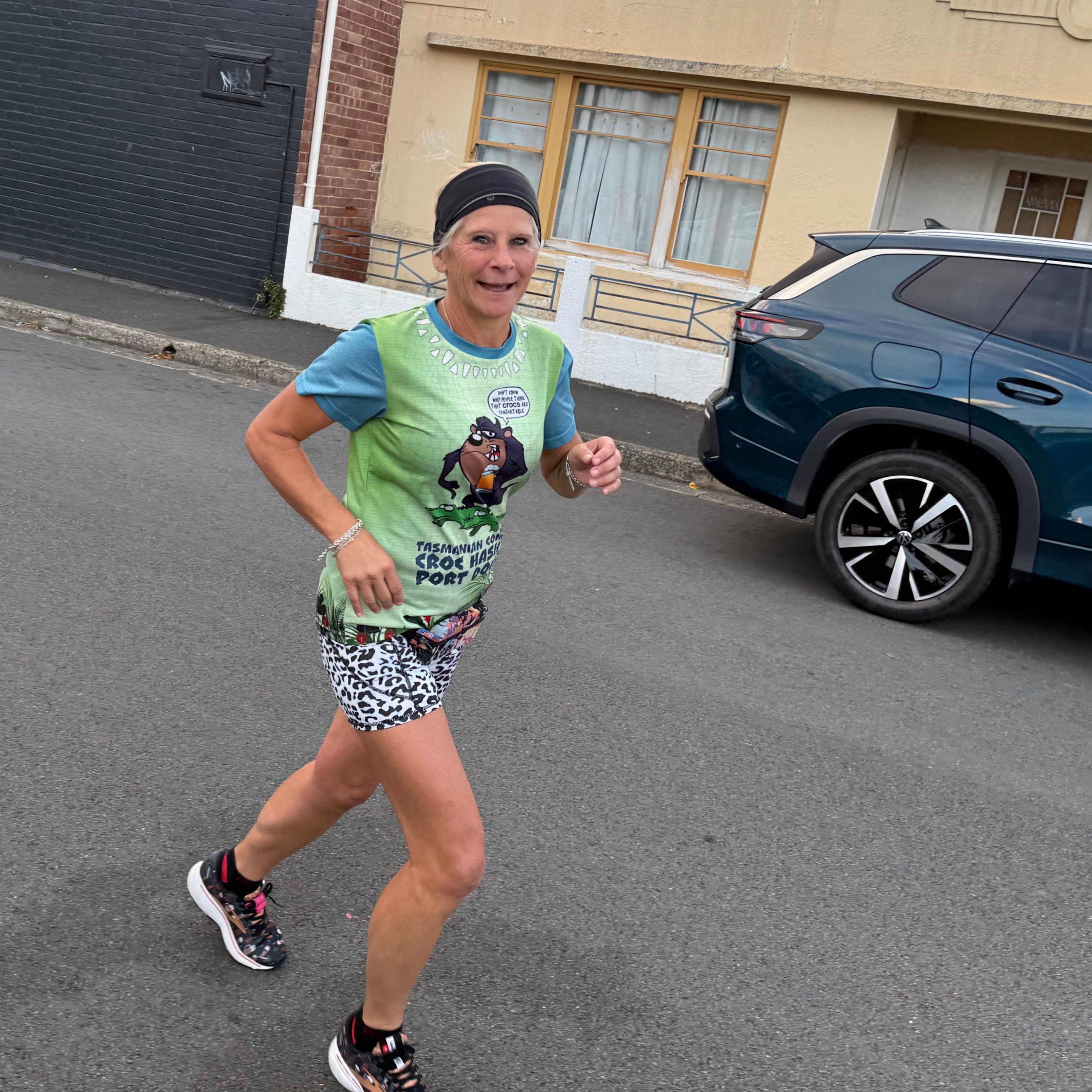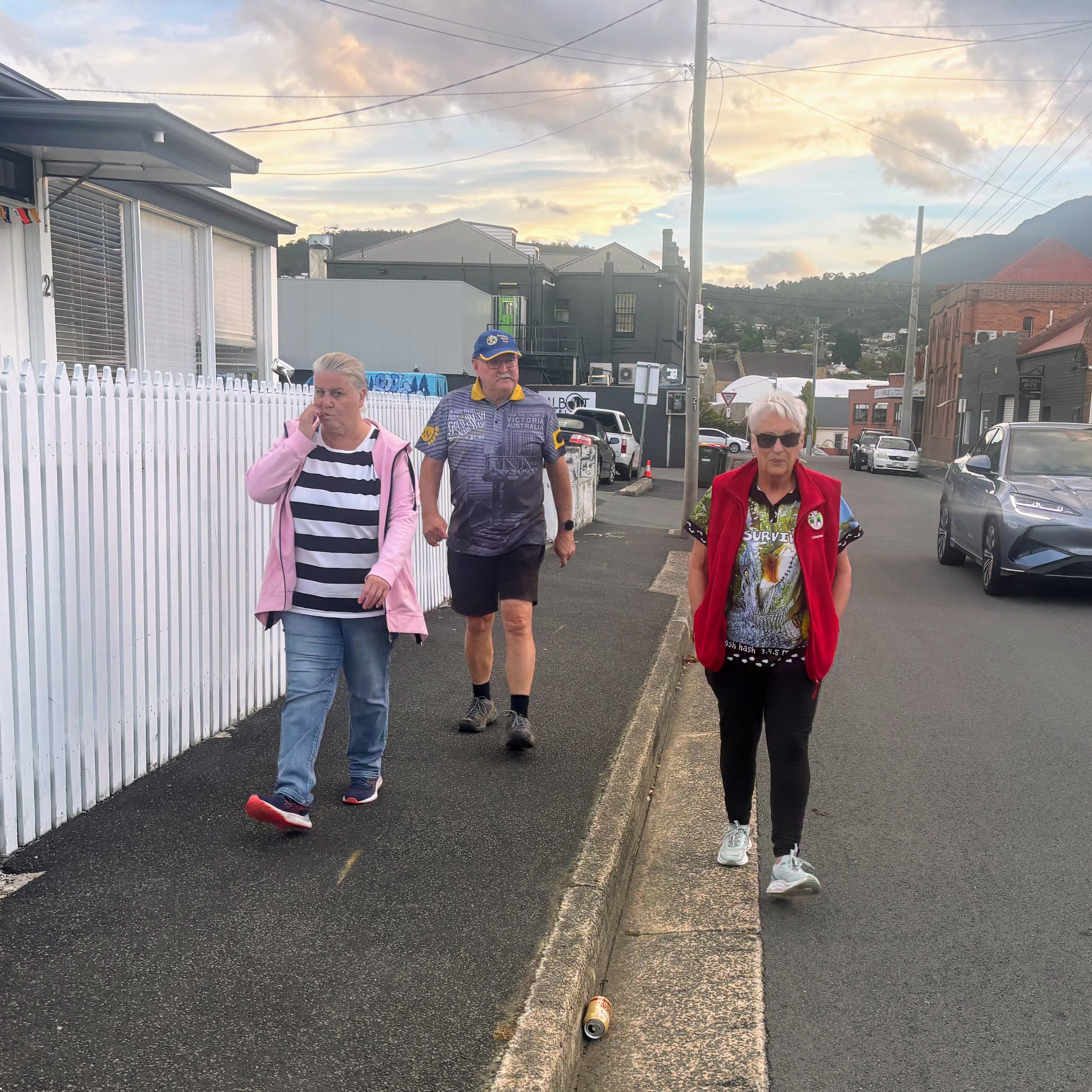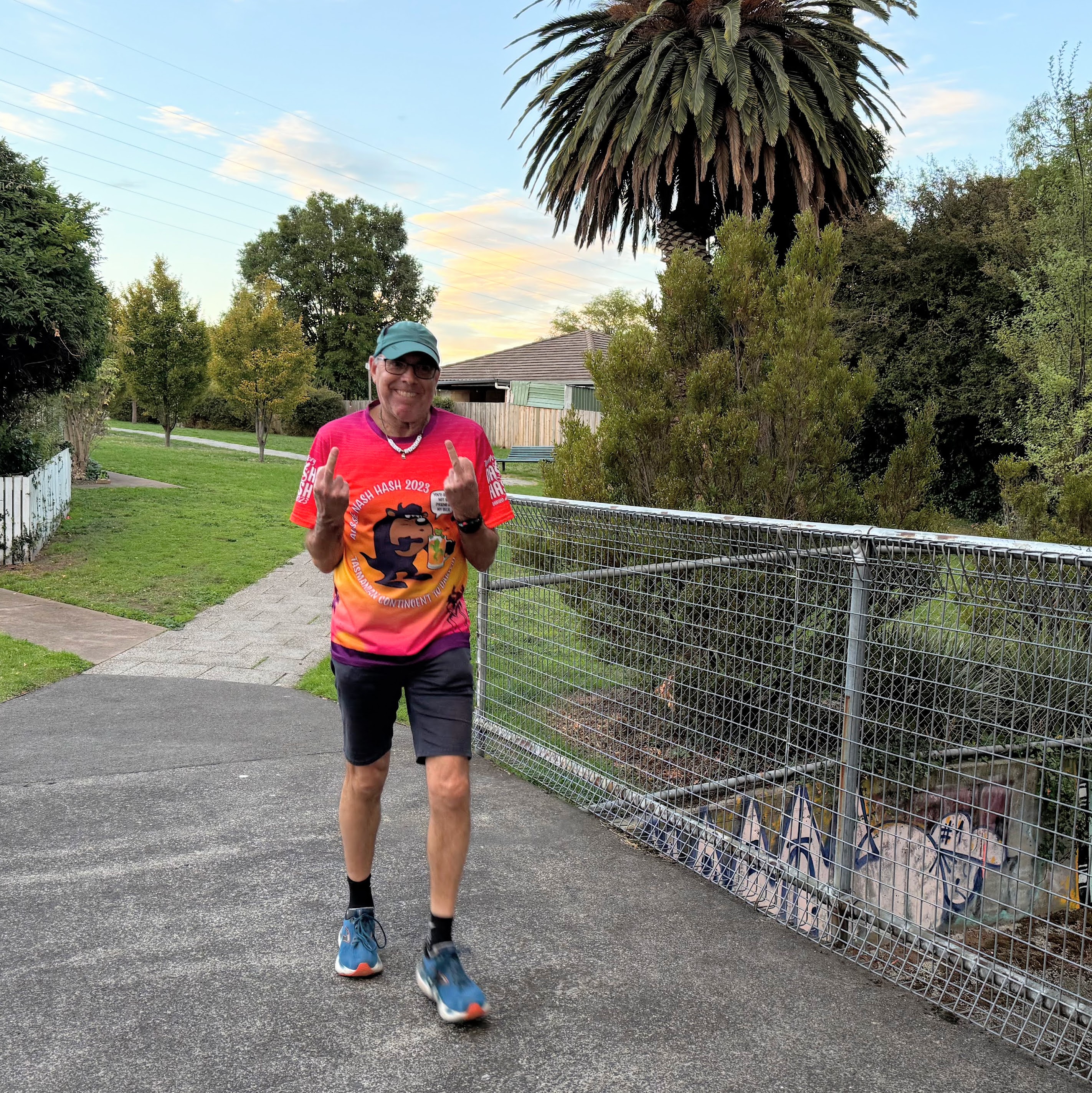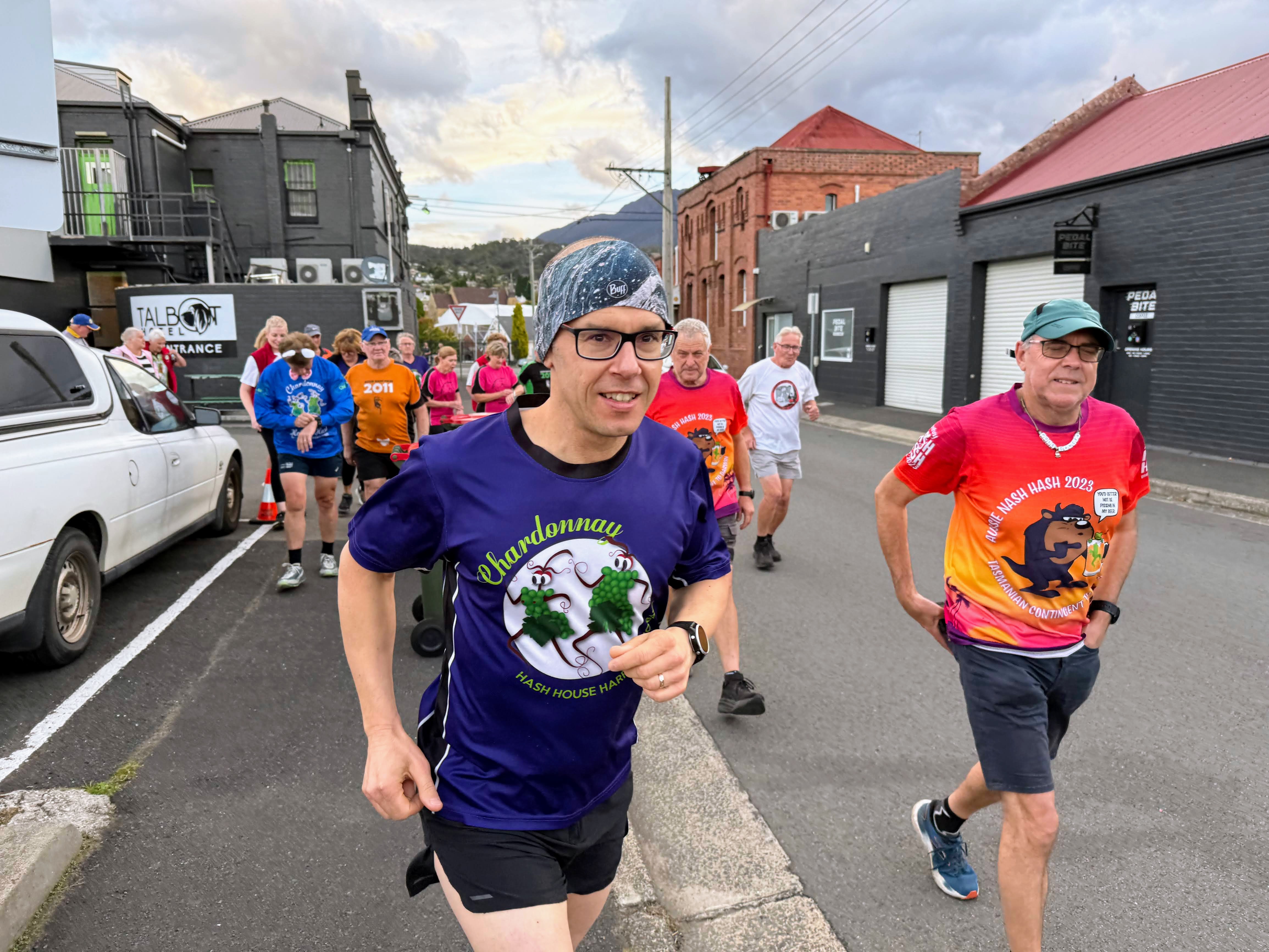 Set by Snacky in a late change due to In The Raw being away (I could have sworn he was there on Hash Cash duties), the walkers were told that they would be doing approximately 4.79km with the runner’s trail measured by trundle wheel at 5.98km. Unfortunately, no p*ss stop or egg hunt, which meant that most of the walkers either stayed behind at the pub or walked to the corner and back. The walkers trail did a loop around New Town, with Griz, Poley, Slippery, Xena and Pee Wee leading the way up towards Bishop Street.