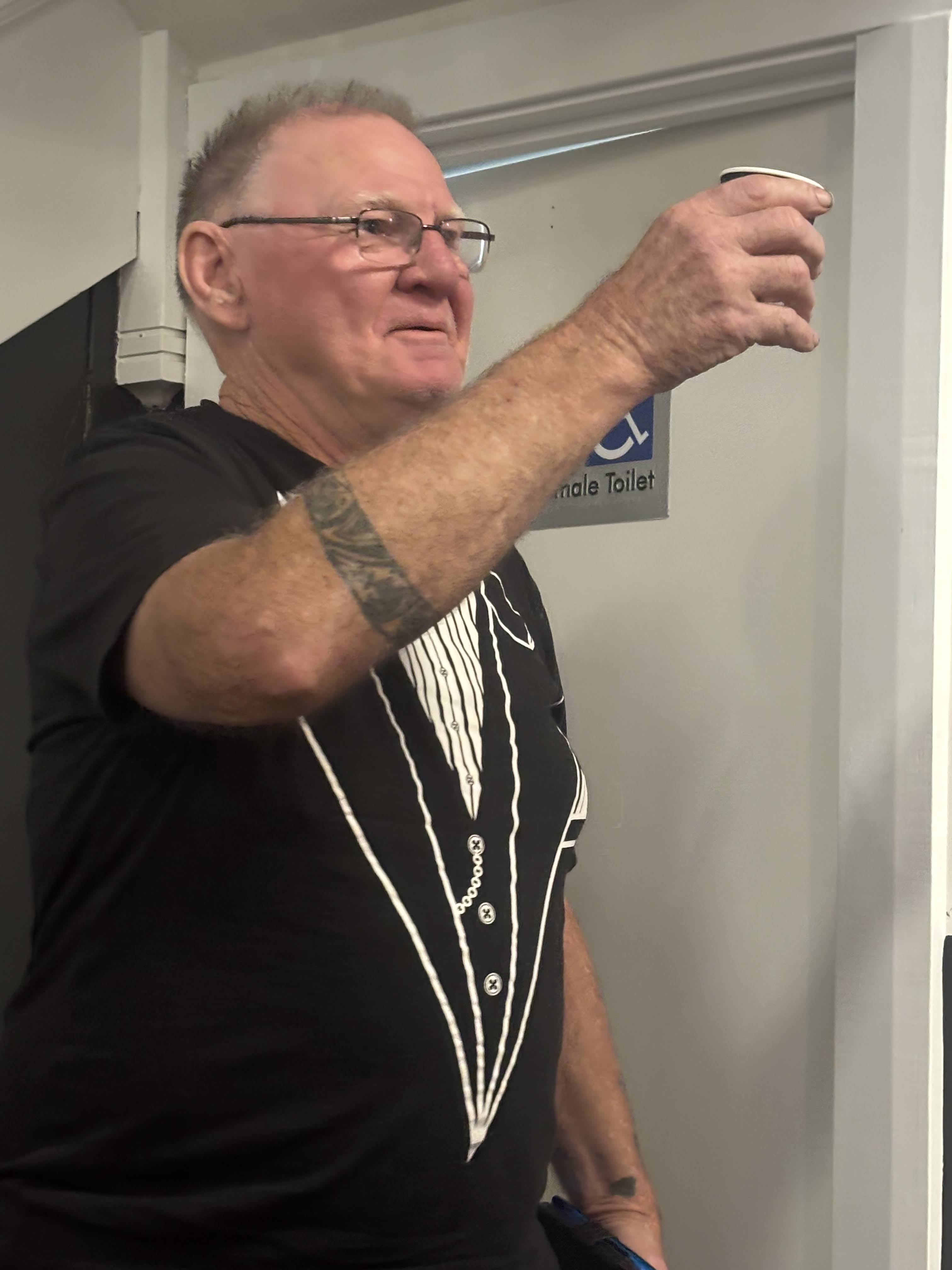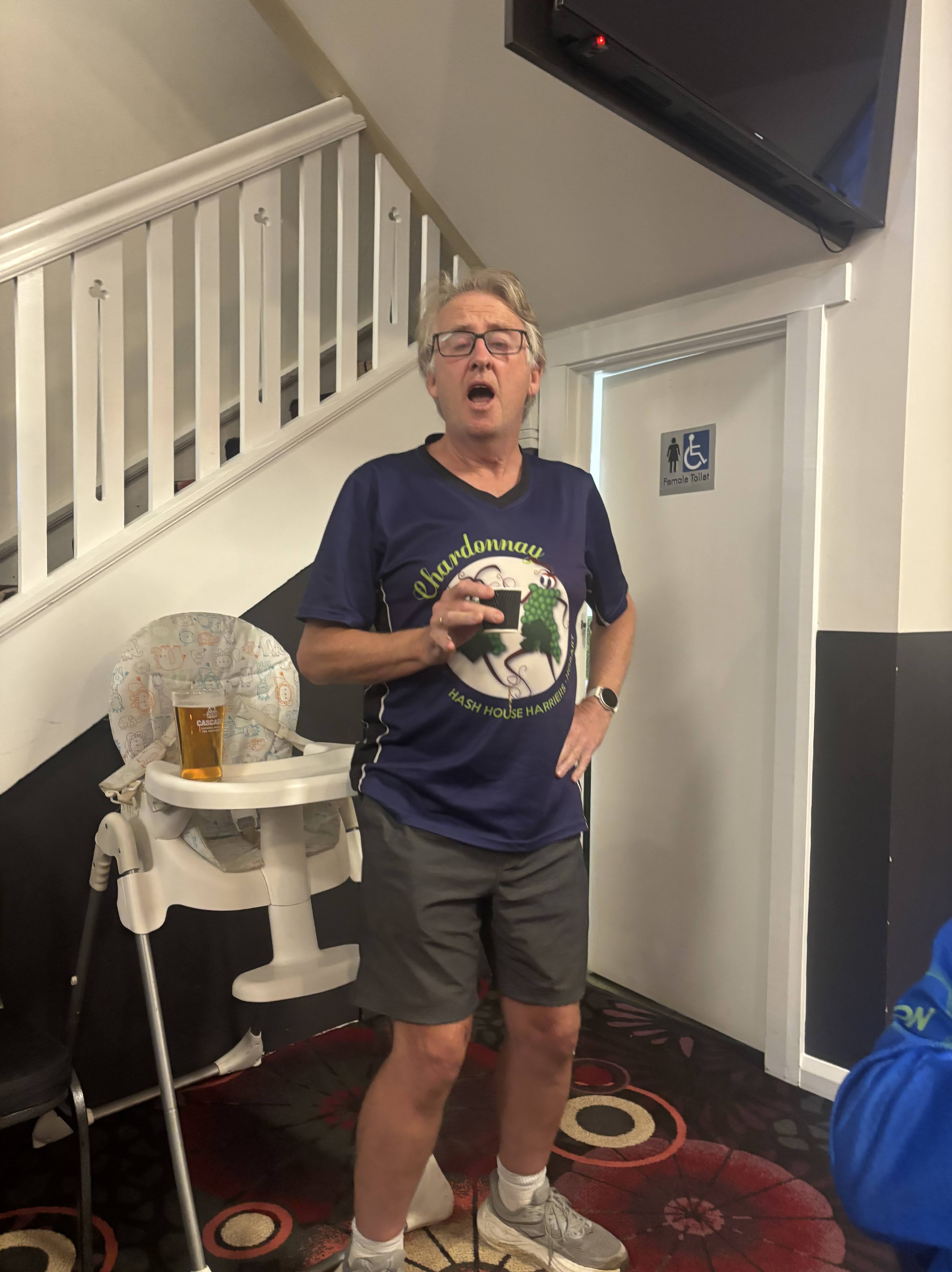 - Hooray: Turned up to retirees’ bike Hash, forgot to unclip and fell off his bike.